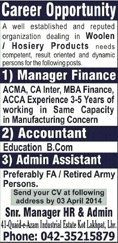Jobs In Woolen / Hosiery Products Organization Lahore