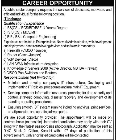 IT In charge Jobs In Public Sector Company Pakistan 2014. Copyright The Daily The Jang Newspaper Pakistan.