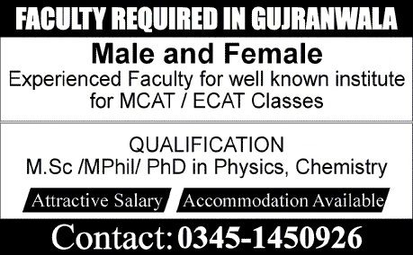 MCAT / ECAT Faculty Required In Gujranwala 2014