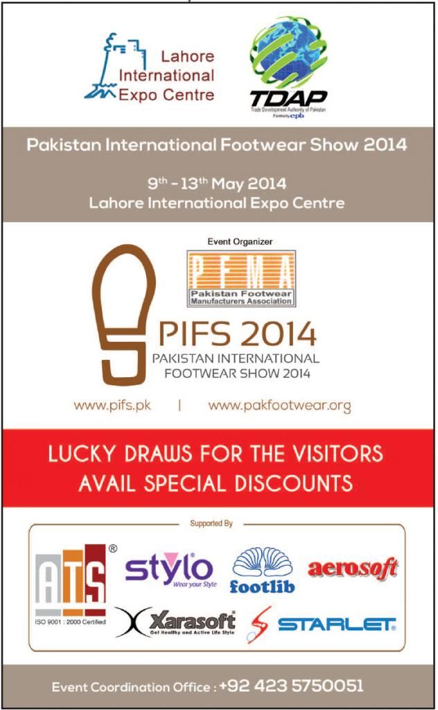 Pakistan International Footwear Show 09th -13th May 2014. Copyright The Daily The Jang Newspaper Pakistan. Organizer Pakistan Footwear Manufacturers Association.