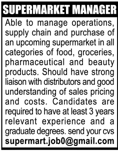 Supermarket Manager Jobs In Upcoming Supermarket. Copyright The Daily The Jang Newspaper Pakistan.