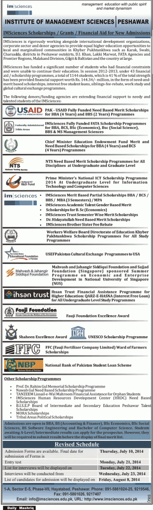 IM Sciences Scholarships Grants Aids For New Admissions. Copyright The Daily The Mashriq Newspaper Pakistan.