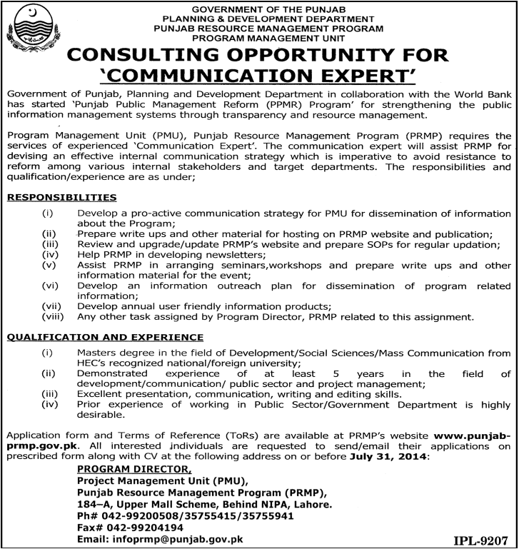 Consulting Opportunity For Communication Expert Punjab Government Pakistan 2014. Copyright The Daily The Jang Newspaper Pakistan.