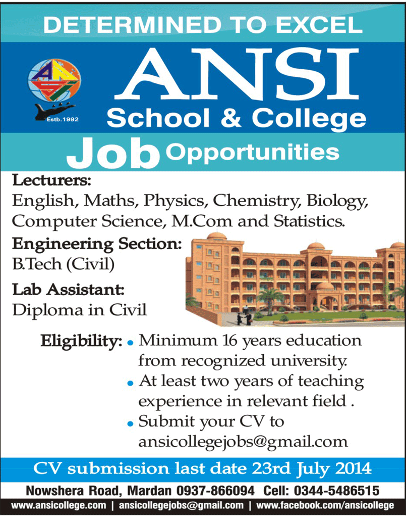 ANSI School ANSI College ANSI Pakistan 2014. Jobs ANSI School and College Mardan Pakistan 2014. Copyright The Daily The Mashriq Newspaper Pakistan.