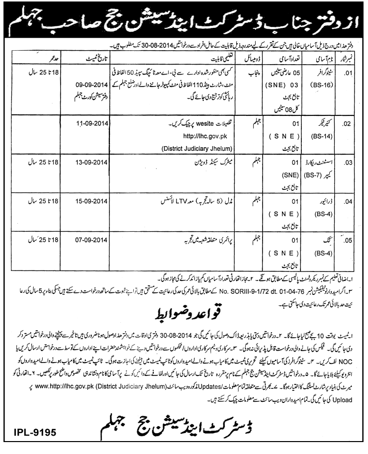 Jobs District and Session Court Jhelum Pakistan 2014. Copyright The Daily The Jang Newspaper Pakistan.