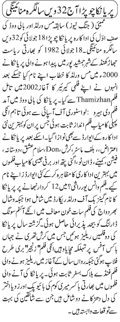 Priyanka Chopra 32nd Birthday 2014 Date 18th July. Copyright The Daily The Jang Newspaper Pakistan.