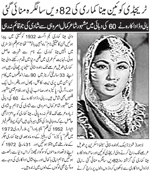 Meena Kumari 82nd Birthday On 01st August 2014. Copyright The Daily The Jang Newspaper Pakistan.