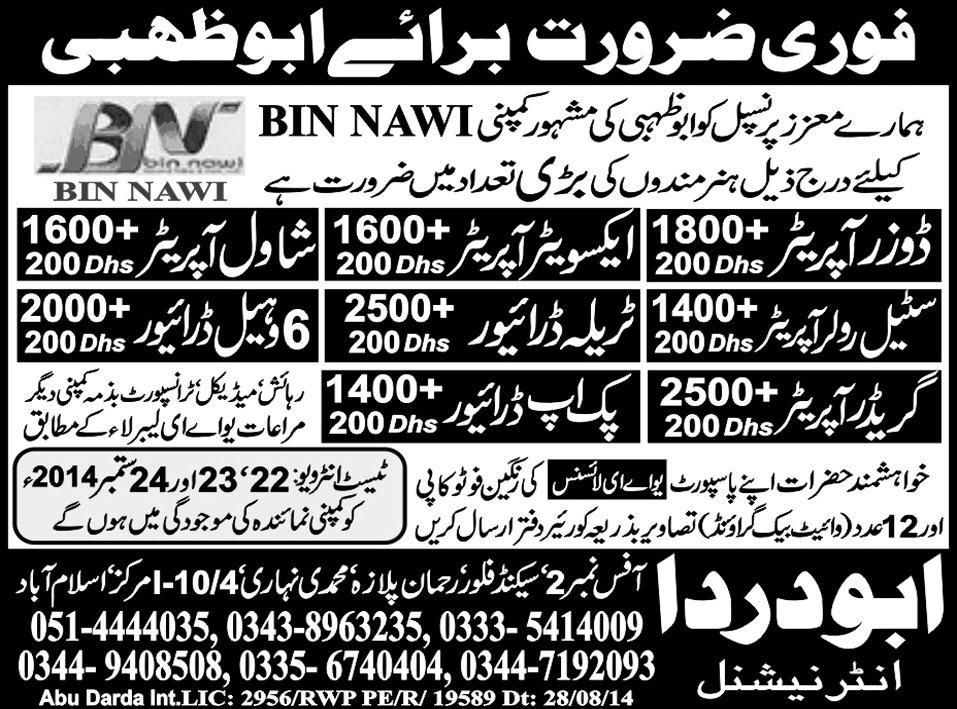 Bin Nawi Group Abu Dhabi Jobs For Pakistanis Sept. 2014. Copyright The Daily The Jang Newspaper Pakistan.