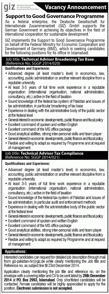 Jobs GIZ Support To Good Governance Programme 2014. Copyright The Daily The News Newspaper Pakistan.