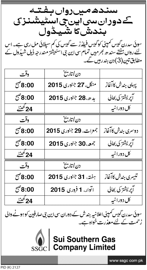 CNG Closure Schedule in Sindh 27 Jan. - 01st Feb. 2015. Copyright The Daily The Jang Newspaper Pakistan.