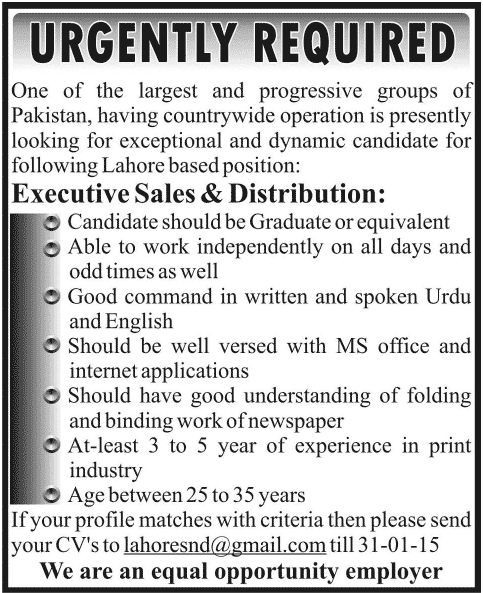 Executive Sales and Distribution Job In Lahore Jan. 2015. Copyright The Daily The News Newspaper Pakistan.