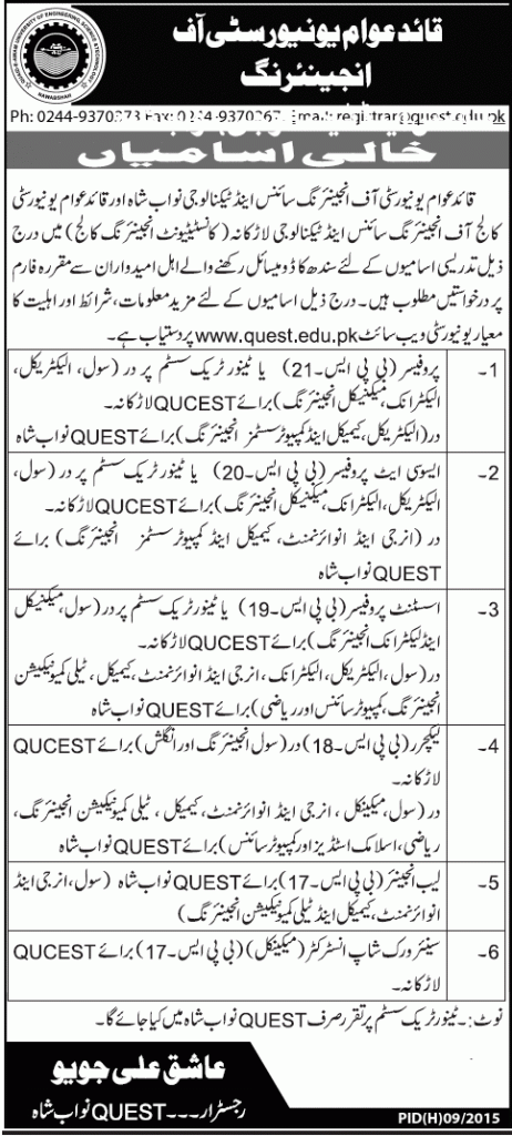 Jobs Quaid E Awam University of Engg. Nawabashah & Larkana