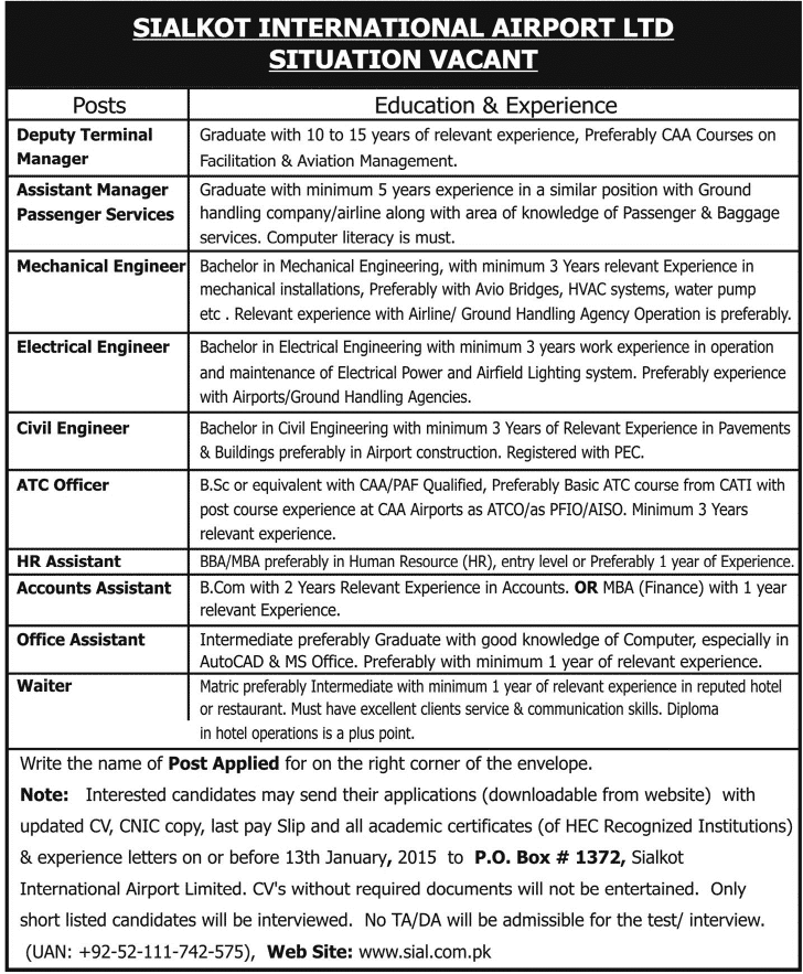 Jobs Sialkot International Airport Ltd. 13 Jan 2015