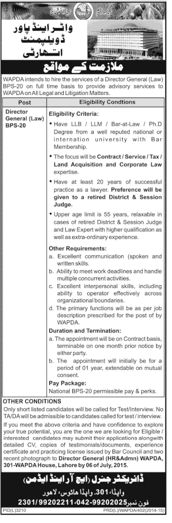 Director General Law Jobs WAPDA June 2015. Copyright The Daily The News Newspaper Pakistan.
