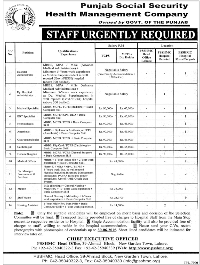 Jobs Punjab Social Security Health Management Co. June 2015
