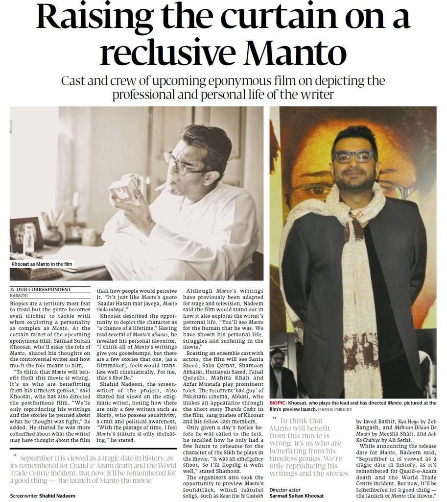 Eponymous Pakistani Film Manto Lead and Directed By Sarmad Sultan Khoosat. Copyright The Daily The Tribune Newspaper Pakistan.