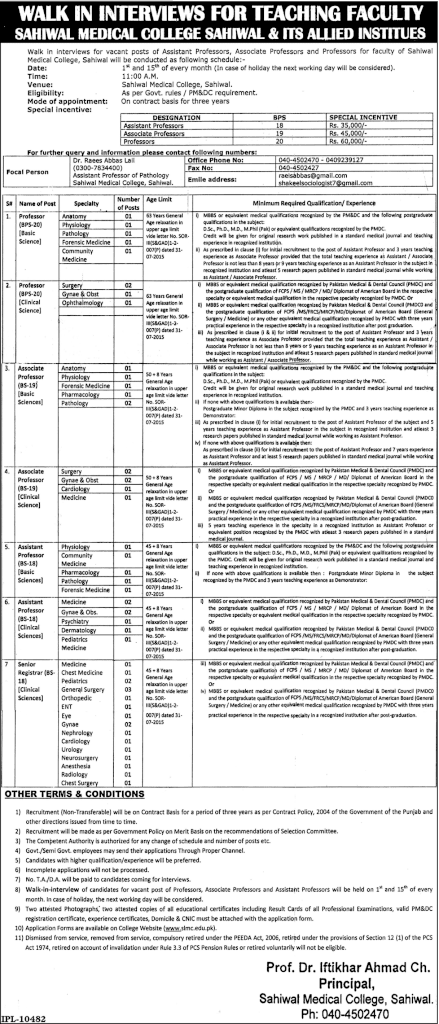 Teaching Jobs Sahiwal Medical College & Its Allied Institutes